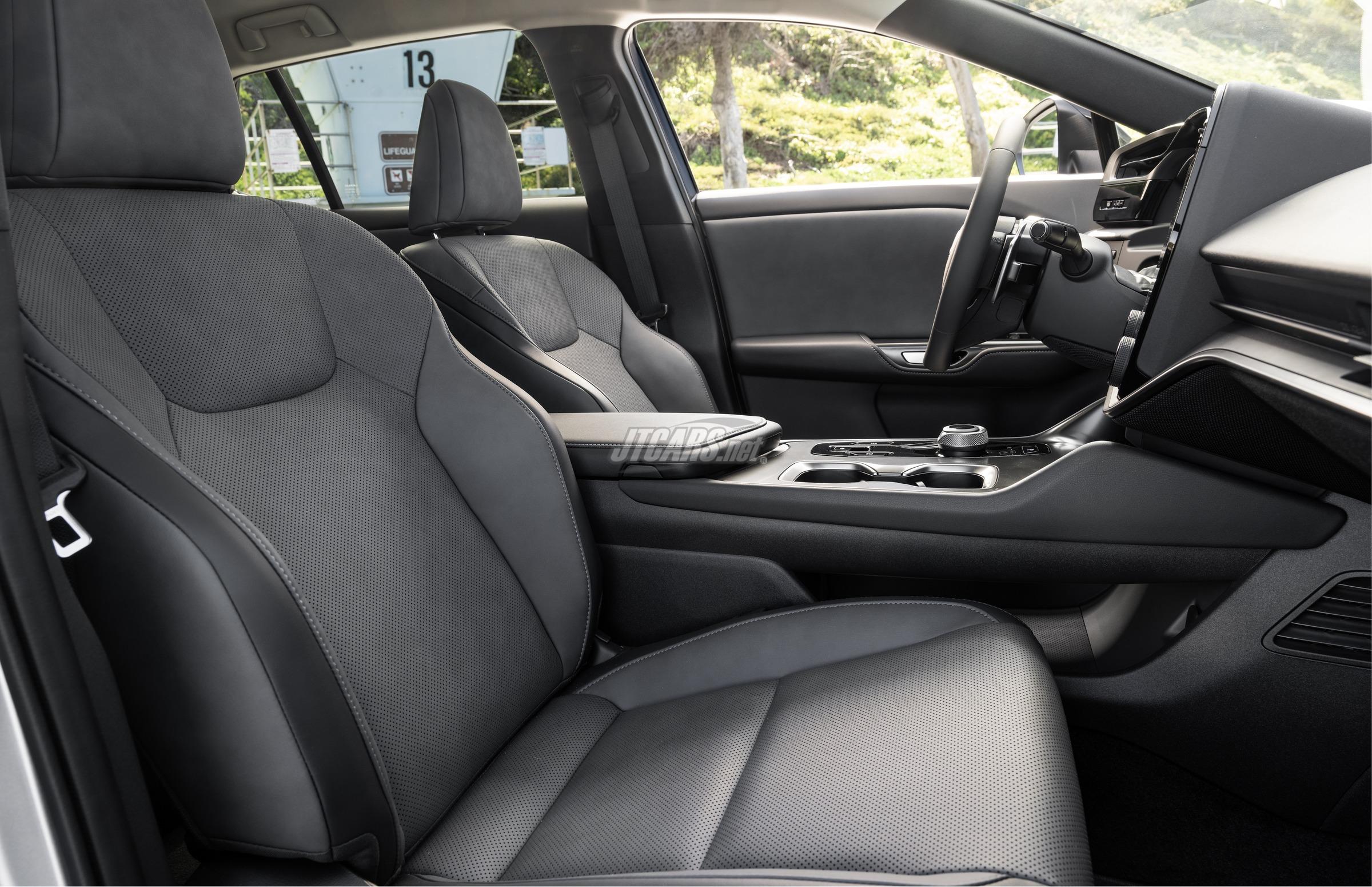 The *oto-kukan* (sound space) concept ensures a quiet cabin by reducing exterior noise through slim A-pillars, a continuous hood seal, sound-dampening materials, and Active Sound Control (ASC). ASC enhances interior serenity by canceling unwanted noise while providing clear EV feedback.