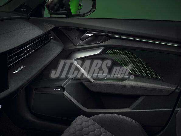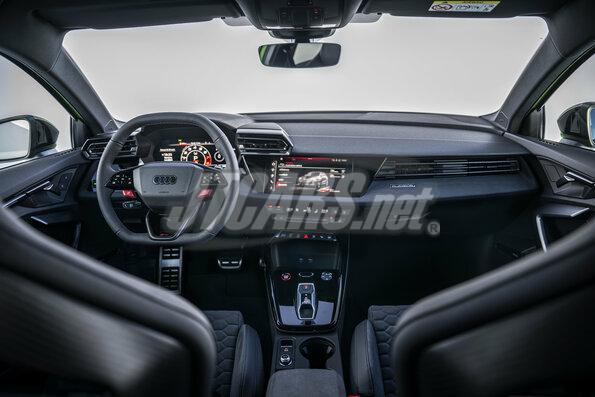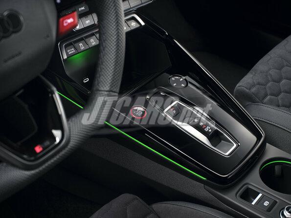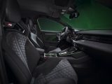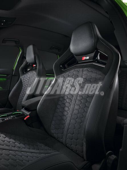 In the interior, too, which is dominated by dark color tones, everything is geared for performance, with the new steering wheel, RS sport or bucket seats, carbon features, and sporty displays. The seat center panel with RS honeycomb stitching is made of the microfiber fabric Dinamica, which is combined with Pearl Nappa leather on the side bolsters. Beneath the headrest, the black tapered insert features a large RS badge and, like the matt carbon rear of the seat backrest, emphasizes the sportiness of the RS 3.