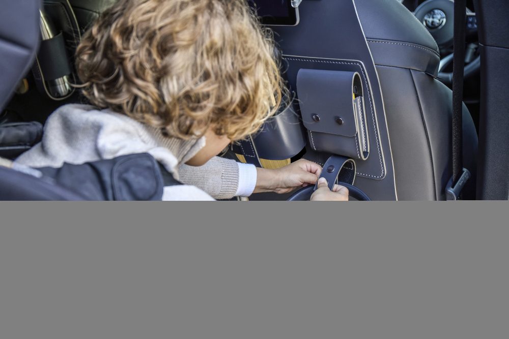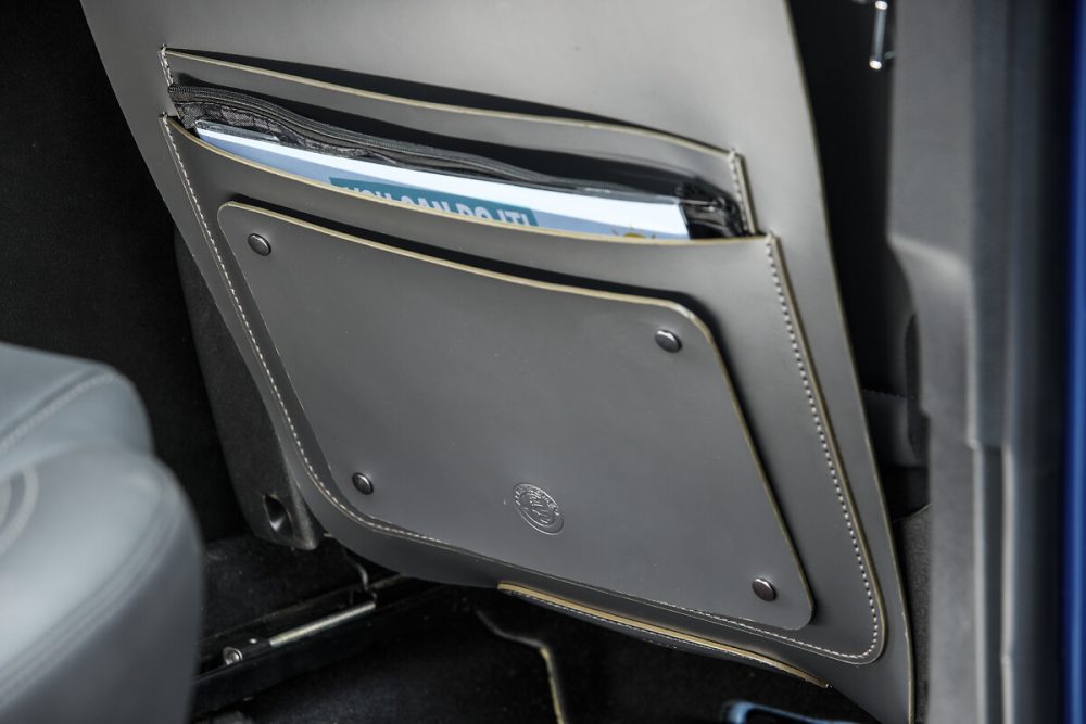 In keeping with the rest of the interior, the seat tidies are made from grey leather with matching stitching and an embossed Alfa Romeo logo. The Alfa Romeo research revealed that children typically kick the back of the front seats 3.5 times per journey, so the design incorporates protective panels to help maintain their premium finish.