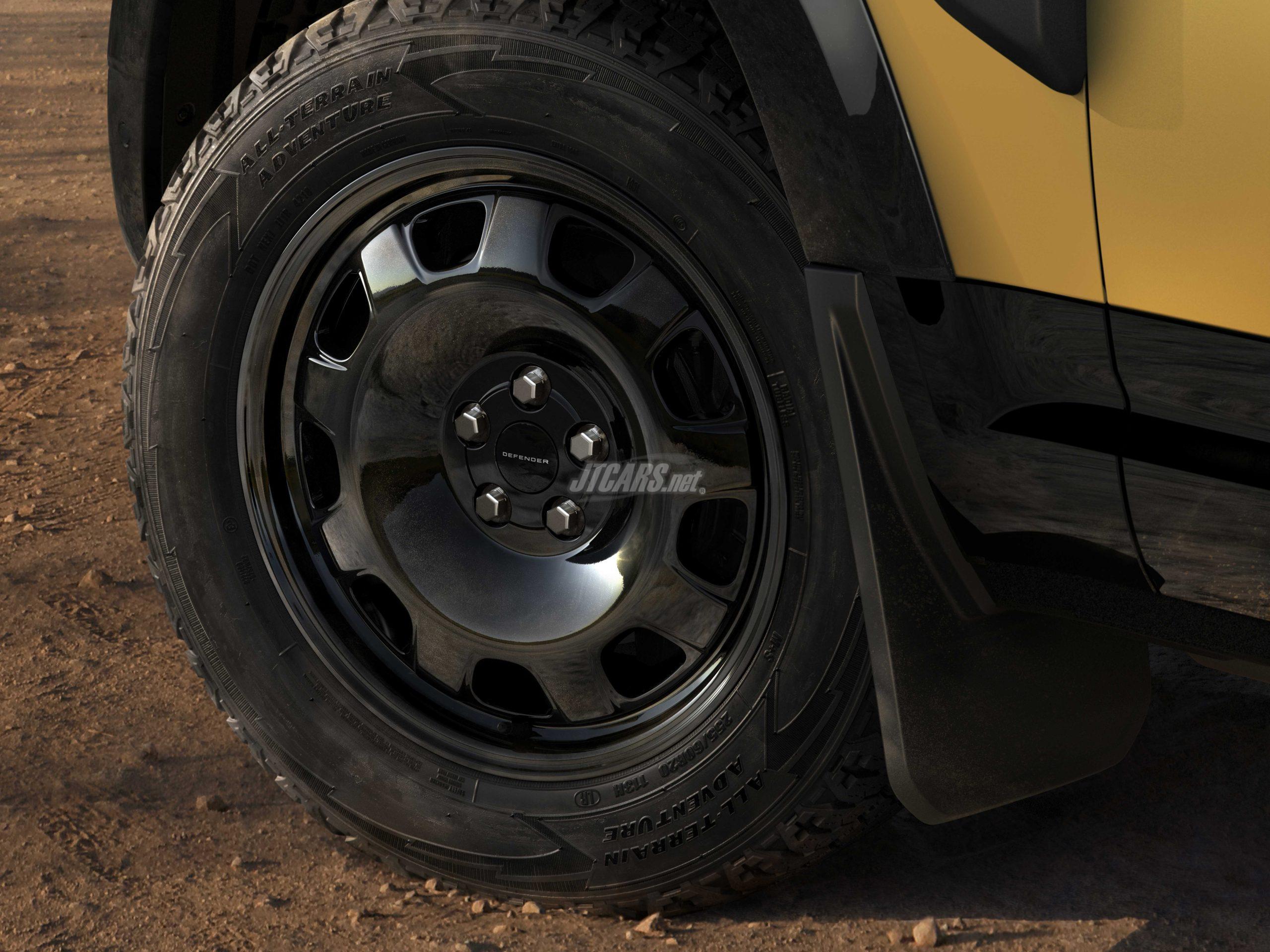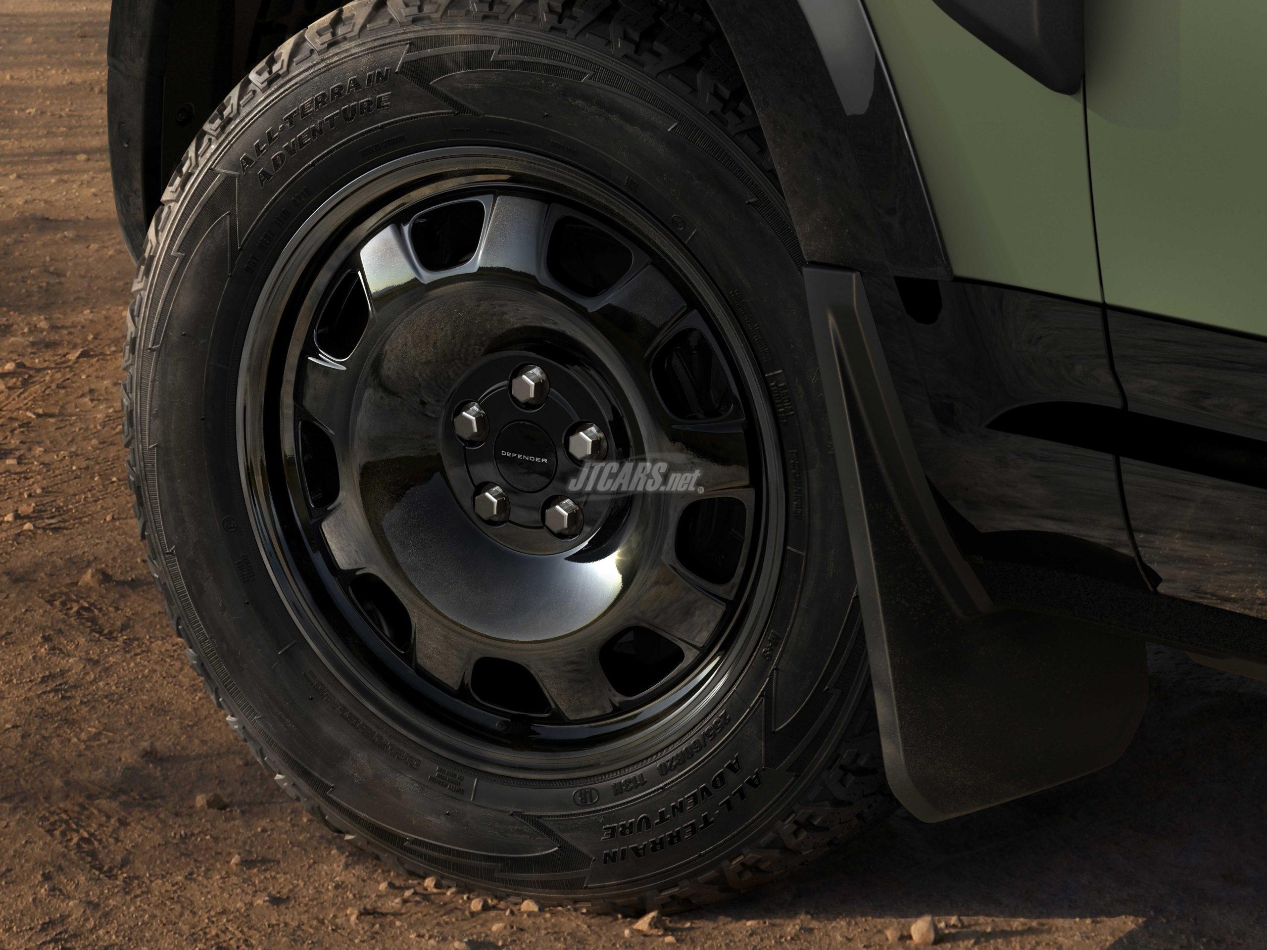 The adventure‑ready specification includes new Gloss Black 20‑inch alloy wheels wearing rugged All‑Terrain Tyres for reliable grip on all surfaces, a Dark Rear Scuff Plate and Gloss Black Wheelarch Protection, with a Black front undershield.