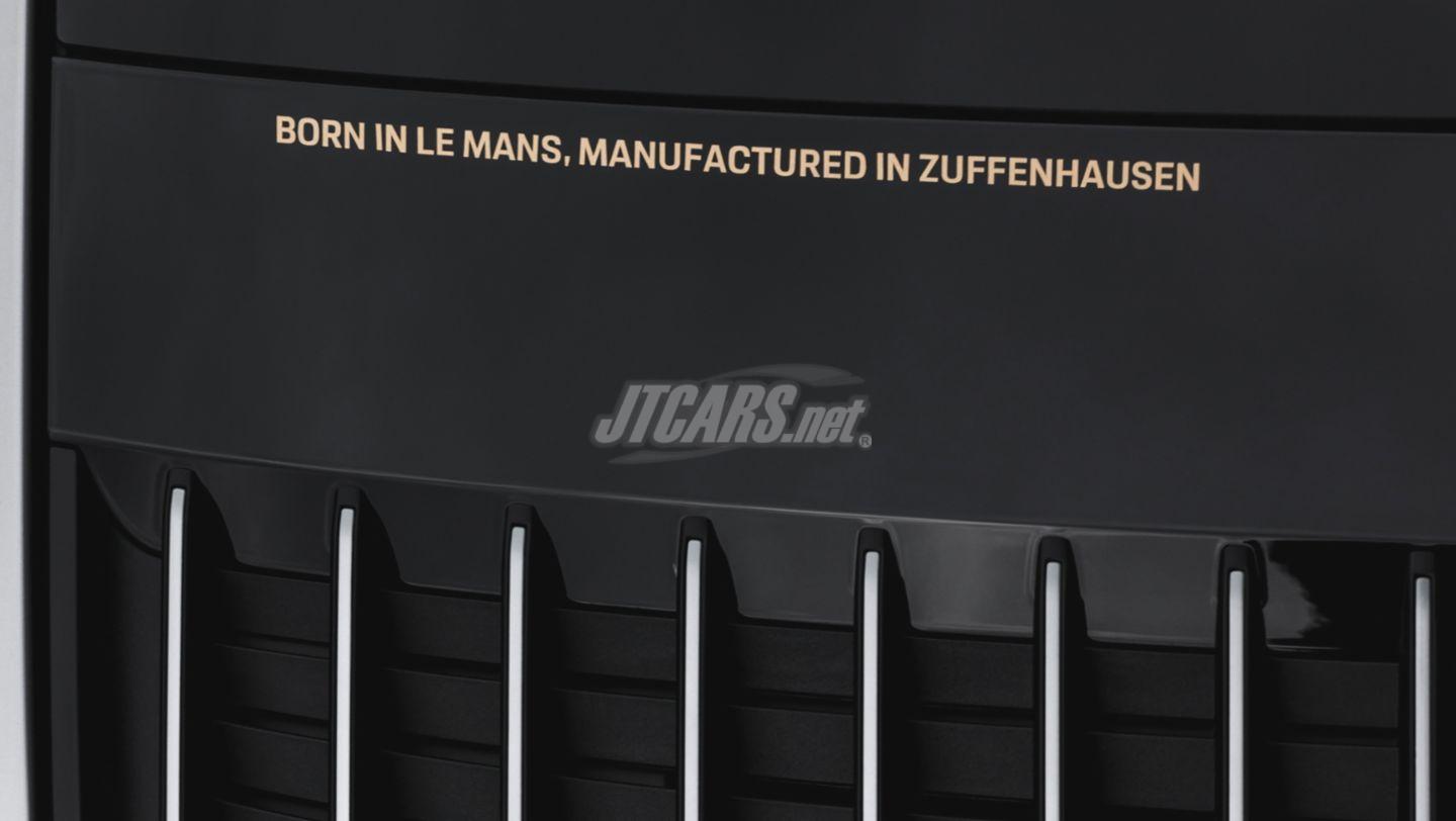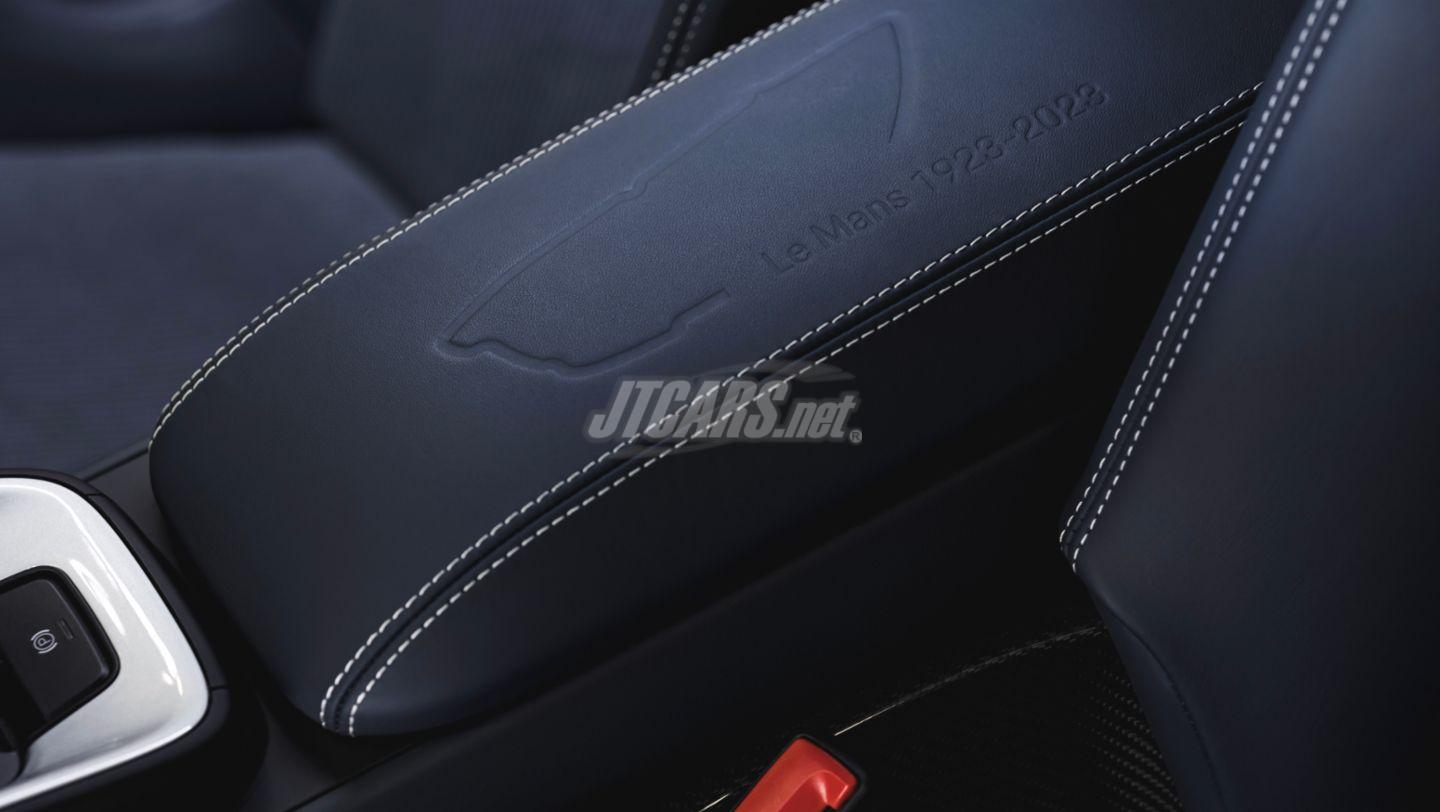 The concept of the 911 Carrera GTS Le Mans Centenaire Edition has been maturing since 2020. The special occasion was the 100th anniversary of the 24 Hours of Le Mans. Numerous design details were developed specifically for this 911. For example, a badge with the "24h Le Mans" logo and laurel wreath design on the rear lid grille as well as a high-quality badge with the Le Mans race track outline in French tricolour and the anniversary lettering on the B-pillar are reminders of the endurance classic. The "Born in Le Mans, Manufactured in Zuffenhausen" decorative decal on the rear end also attracts attention, underlining the supra-regional cooperation. Individual elements of the interior can also be seen as a tribute to the 24 Hour race: for example, the Le Mans racetrack embossed on the centre armrest, the "24h Le Mans" logo on the headrests or the model lettering on the door sill trims.