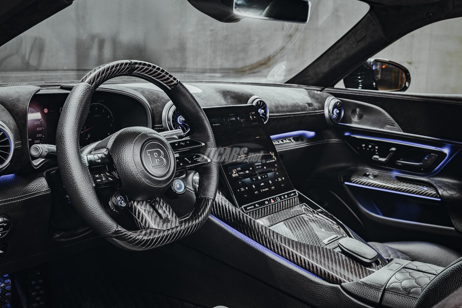 As with every BRABUS supercar, the interior of the new ROCKET GTS features a wide range of perfectly integrated design details that underline the exclusive character of the vehicle. Once again complementing the exposed carbon bodywork, the occupants are greeted by carbon entry sill trims with illuminated BRABUS logo. The pedals and parts of the steering wheel rim were made from the same high-end compound, as were the door handles and parts of the center console.