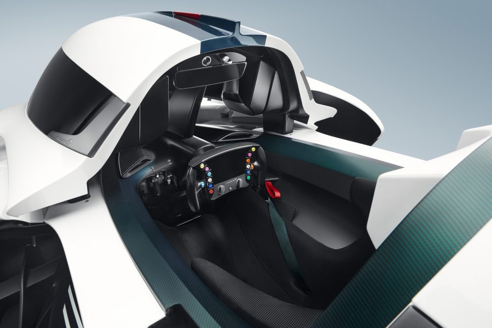 The steering wheel – the design of which is unique among McLaren production cars – takes its inspiration from Formula 1, with dash display and essential controls integrated to suit the tight confines of a single-seater track car. Beyond the steering wheel is a view through the glass ‘bubble’, with integrated halo-style cockpit protection – mounted to which is a rear-view display fed by a wide-angle camera placed within the roll hoop. The perfectly symmetrical 180-degree line of sight provided by the central driving position is further aided by the dramatically styled wheel pods in helping the driver to position the car on a track.