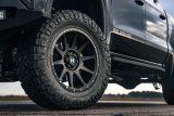 The ‘GOLIATH OFF-ROAD’ package complements the supercharged power upgrade on the GMC Sierra AT4 and adds a custom front steel bumper with ‘GOLIATH’ laser-etched into the plate. An LED lightbar and LED driving lamps are also installed to enhance visibility on- and off-road while further boosting the vehicle’s presence. The chassis is lifted with an off-road suspension upgrade, and Hennessey 20-inch aluminum wheels, with rugged 35-inch off-road tires, replace the stock 18-inch wheels.