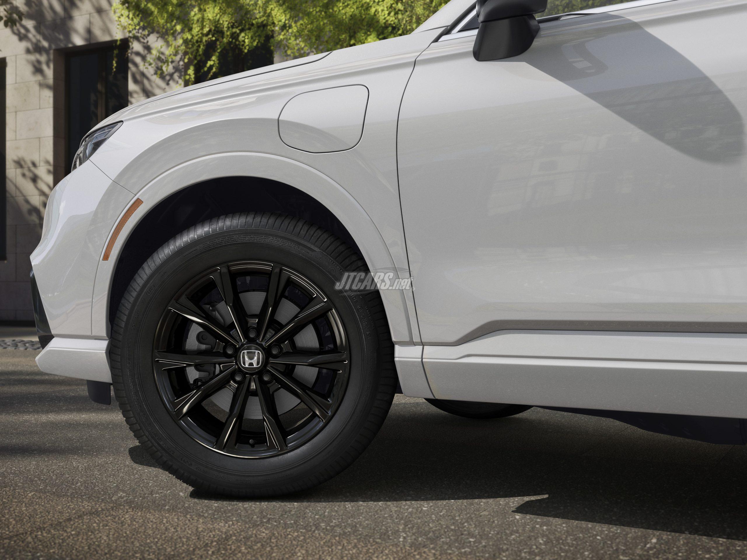 Distinctly styled from CR-V turbo and hybrid models, the sophisticated exterior design of the Honda CR-V e:FCEV stands out with new body panels forward of the A-pillar, unique designs for the liftgate, rear fascia and large 18-inch, 10-spoke black wheels.