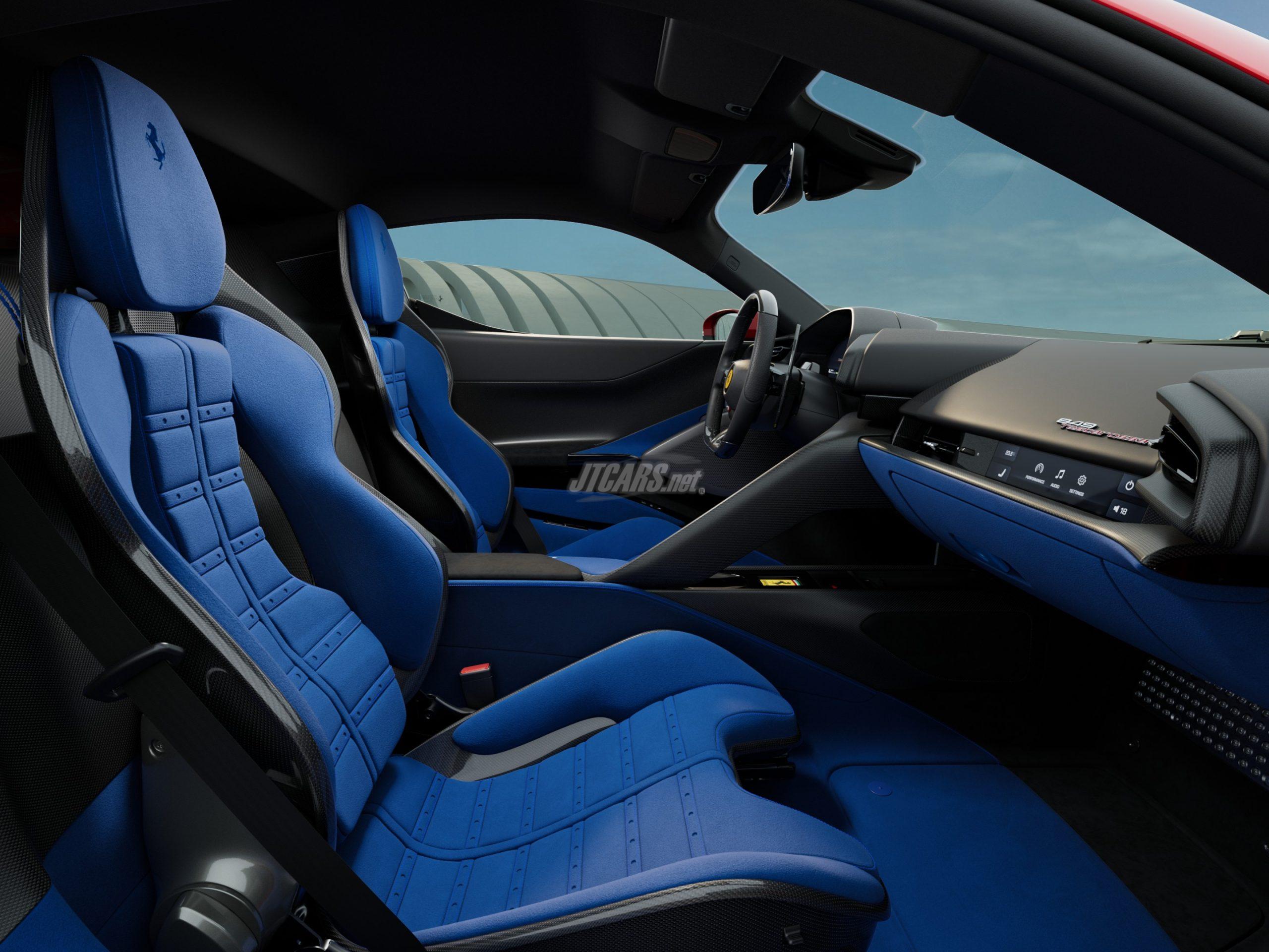 Ergonomics and space have been improved by reshaping the lower door areas, freeing up room for the glove box and rear bench. Seat options include comfort seats with sculpted upholstery that mirrors the cockpit’s geometry, or lightweight carbon-fibre racing seats with enhanced lateral support. Both designs combine style with careful ergonomic study, ensuring functionality without sacrificing Ferrari’s signature sense of drama.