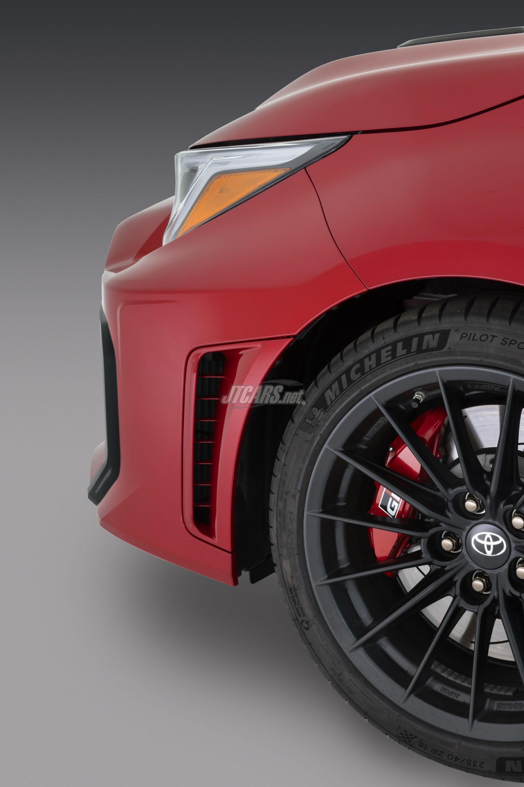 The GR Corolla will be available in three grades: Core, Premium, and the new Premium Plus. It’s built on the TNGA-C platform with a low center of gravity, featuring 18-inch wheels and Michelin® Pilot Sport® 4 tires. The Premium Plus grade includes a carbon fiber roof, vented bulge hood, and matte black wheels.