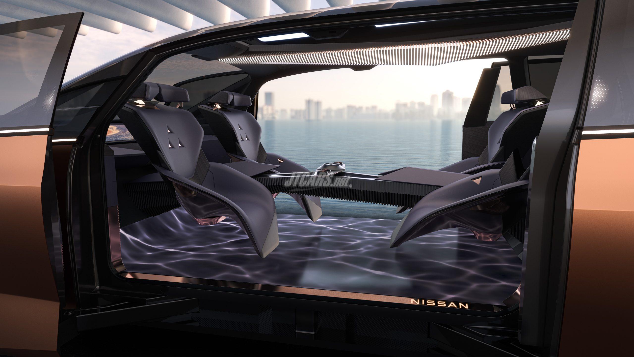 The spacious interior is made possible thanks to the Nissan EV Technology Vision, which consolidates compact components and high-energy density all-solid-state batteries to create innovate car packaging. The result is an ultra-low center of gravity, which when combined with the vehicle’s advanced e-4ORCE all-wheel control system produces smooth and flat acceleration and deceleration. The overhead console and lighting feature traditional Japanese kumiko and koushi patterns that create a sense of luxury, while the flat LED panel in the floor displays imagery of a riverbed and the sky, helping creating a relaxing space where digital and nature are fused.