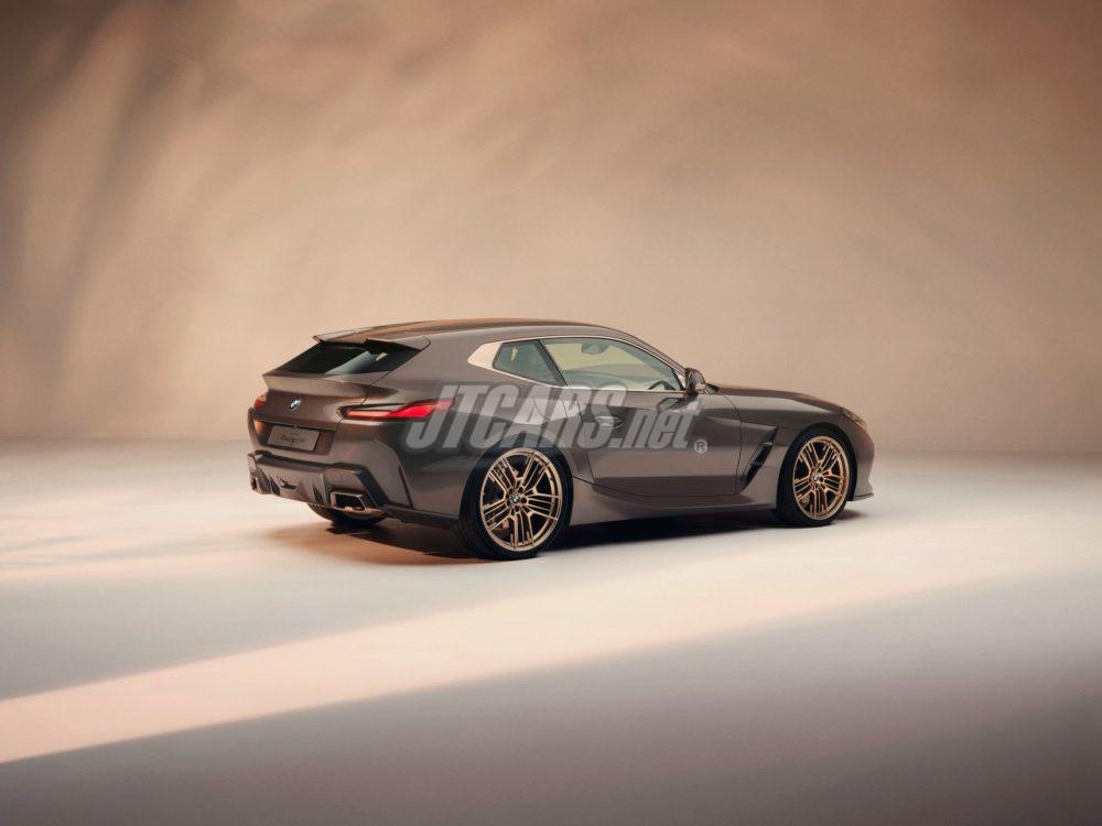 Viewed from the side, the BMW-typical interpretation of the shooting-brake proportions is clearly recognizable. The long bonnet, streamlined roof contours, and powerful rear section form a distinctive two-box design, while the elongated side window graphic with the Hofmeister kink and flared rear wheel arches underline its sporty elegance.