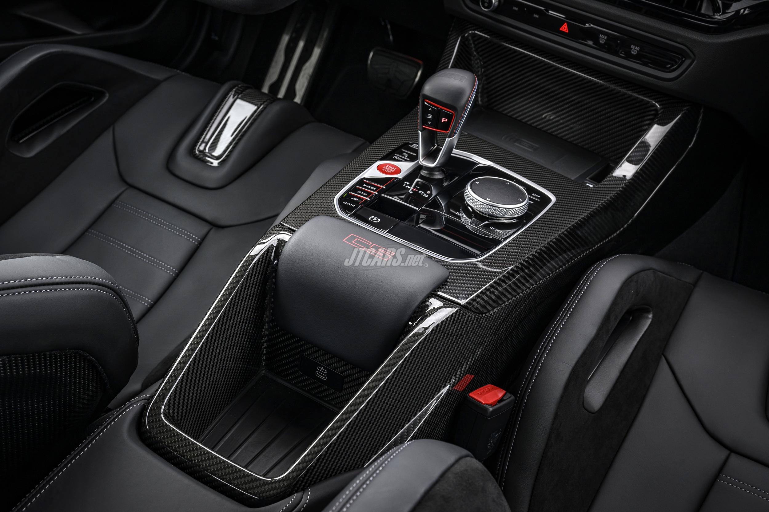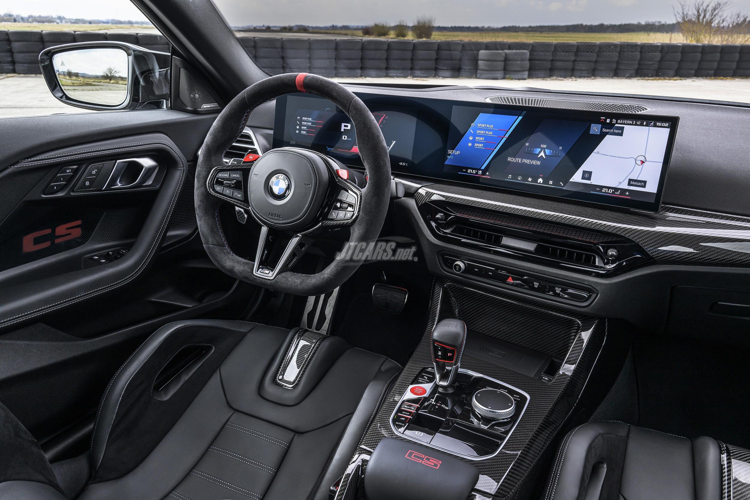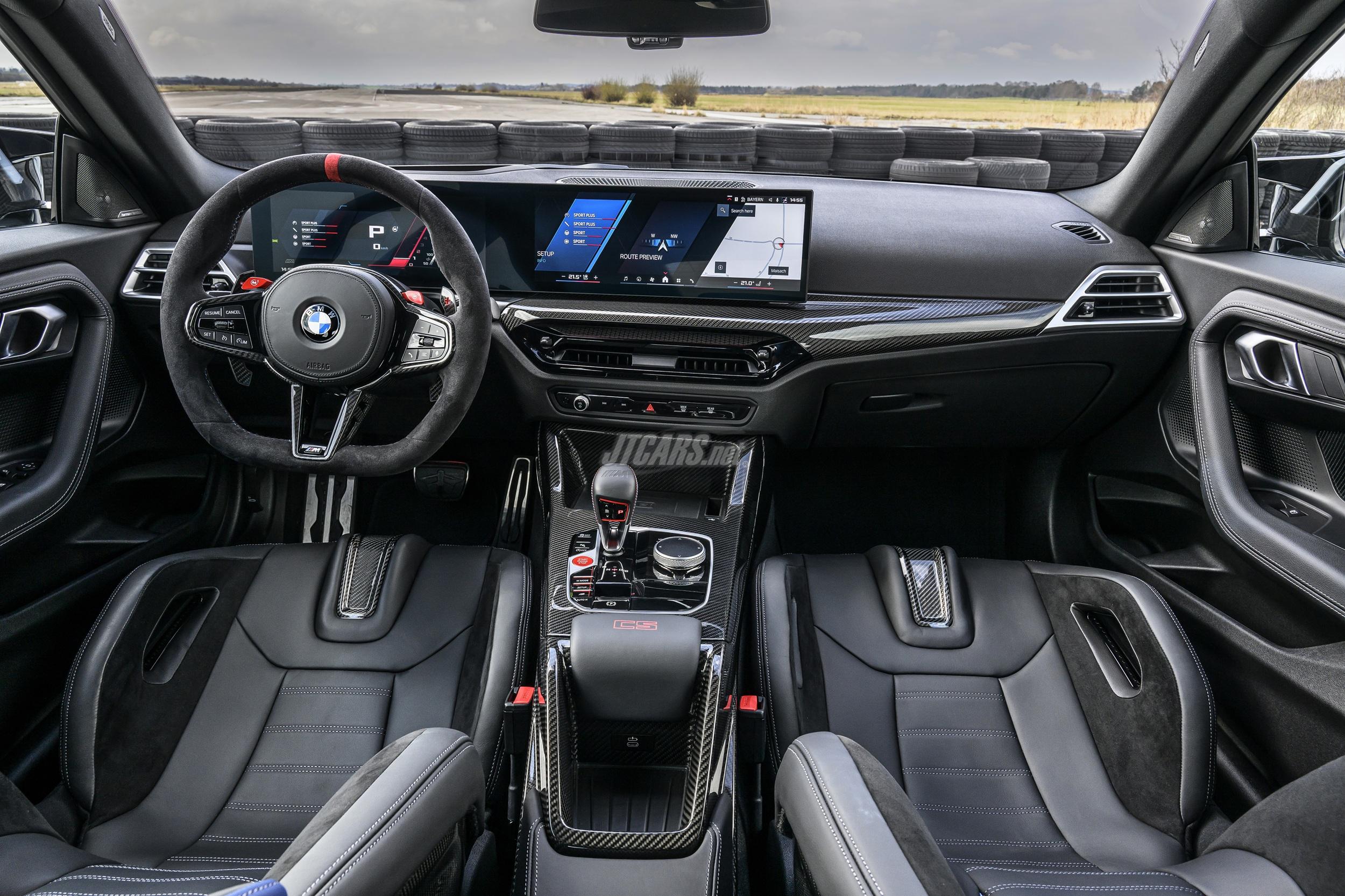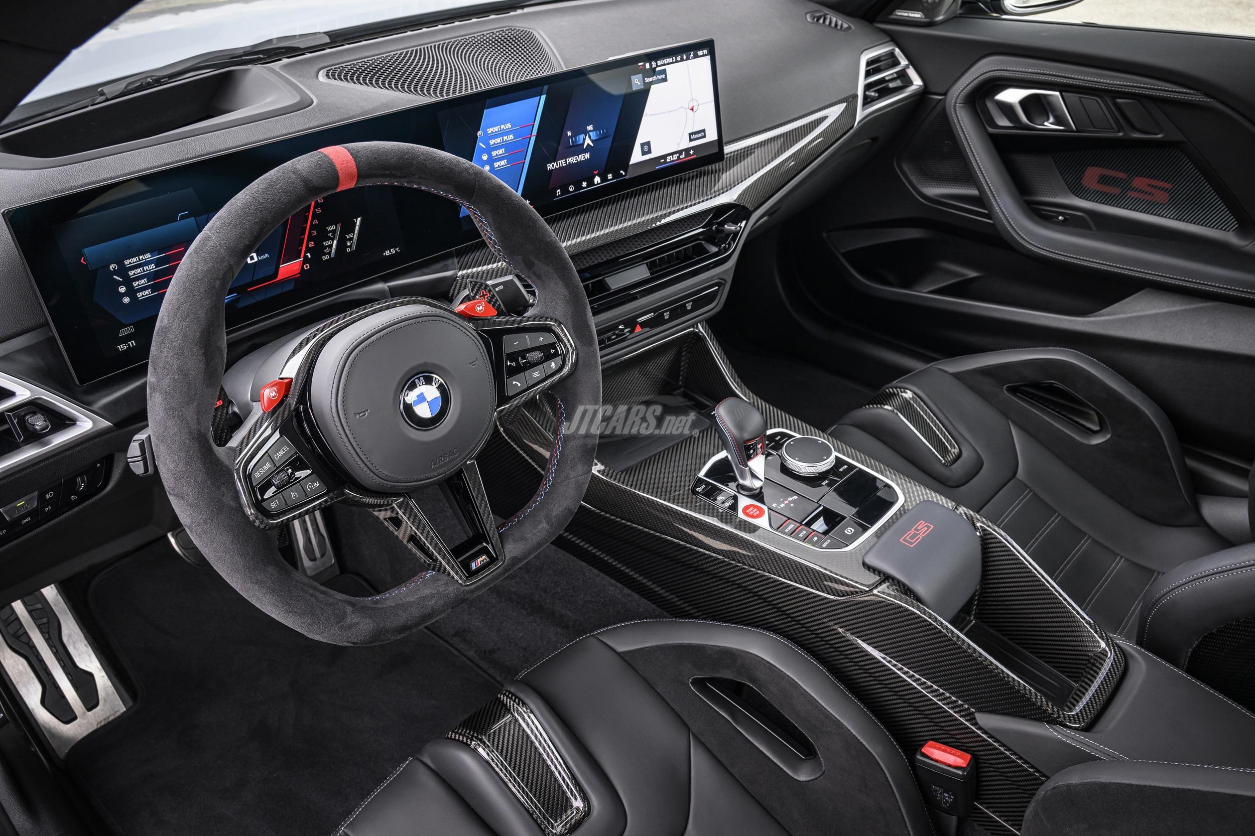 The M Alcantara steering wheel features a flat-bottom design, gearshift paddles, red 12 o’clock marker, and M buttons for custom drive modes. M Carbon Fibre trim decorates the dash and console, while red “CS” logos, M seatbelts, and illuminated M2 CS door sills add unique touches. Ambient lighting, customizable in color, reveals a carbon pattern when off. The M Anthracite headliner completes the sporty feel.