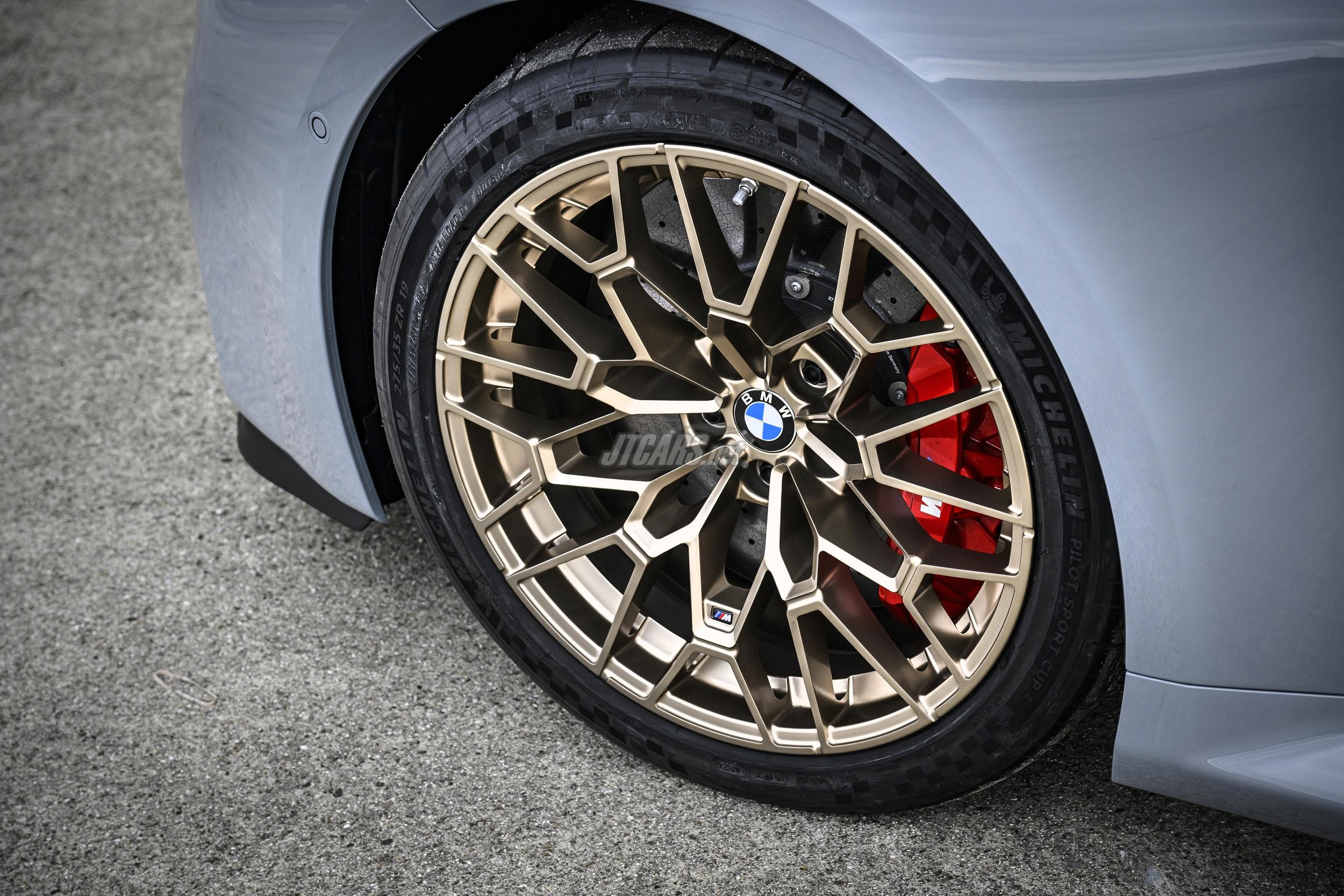 Standard equipment includes red M Compound brakes, with optional M Carbon ceramic brakes. Exclusive forged M light-alloy wheels (19" front, 20" rear) in matte Gold Bronze come fitted with track tyres, while ultra-track or standard sport tyres are available as no-cost options.