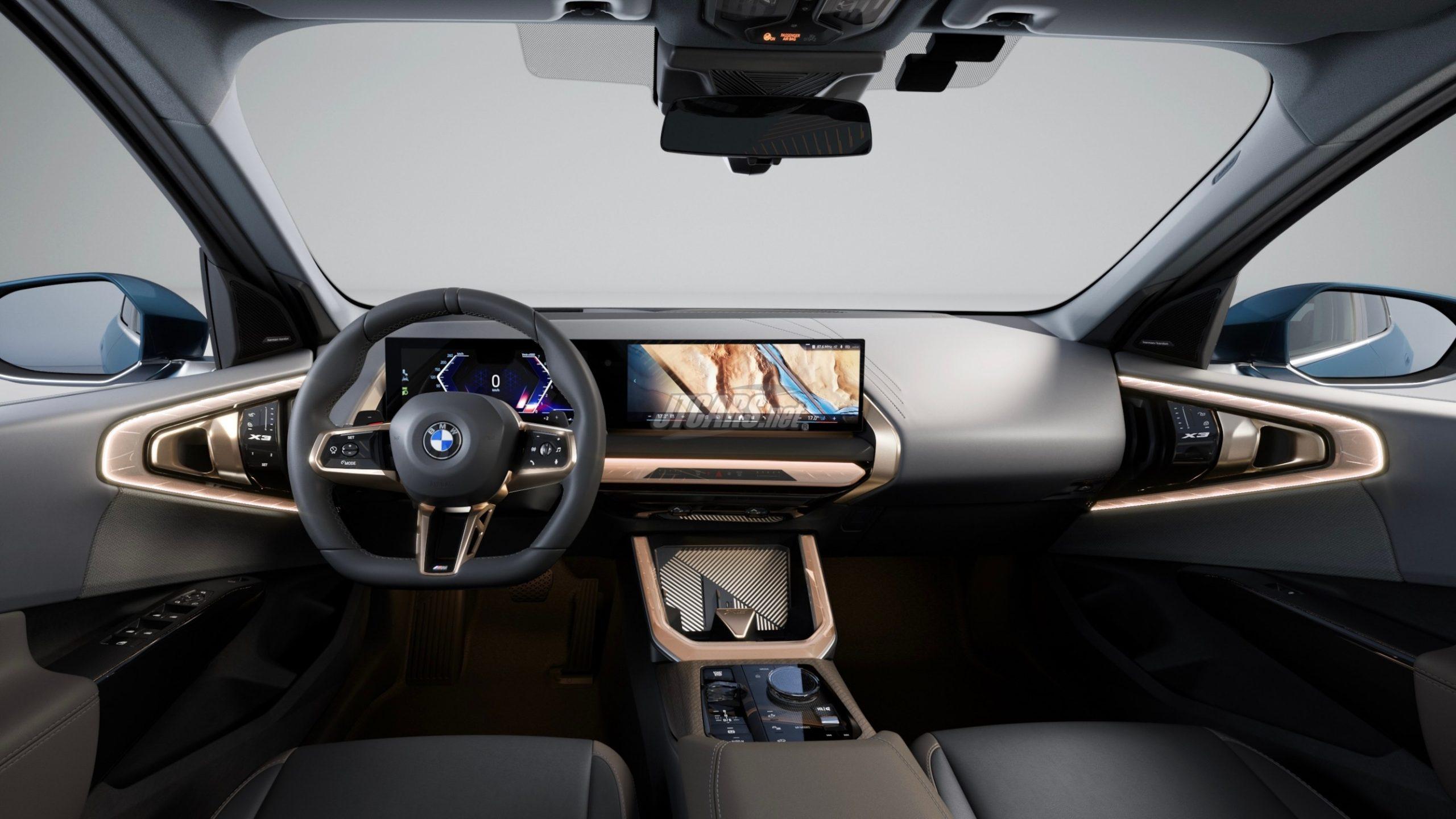 The wheelbase of the new BMW X3 has been increased by 110 millimetres to 2,975 millimetres compared with the globally available model variants of the new BMW X3. The BMW Curved Display, the BMW Interaction Bar, the steering wheel with a flattened lower rim and the colour-contrasting lighting elements in the centre console and door panels create a modern ambience in a new style for the BMW X models. The standard Veganza comfort seats with leather-like characteristics are available in three two-tone colours. The particularly high-quality "Crafted Clarity" glass applications for selected controls are available as an option. In addition to the extra legroom, the standard comfort cushions and centre armrest with integrated tray for wireless charging of suitable smartphones ensure exclusive comfort in the rear. Another highlight is the panoramic glass roof with optional skylounge lighting in several colours and modern graphic display, which complements the ambient lighting in the interior.
