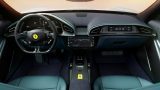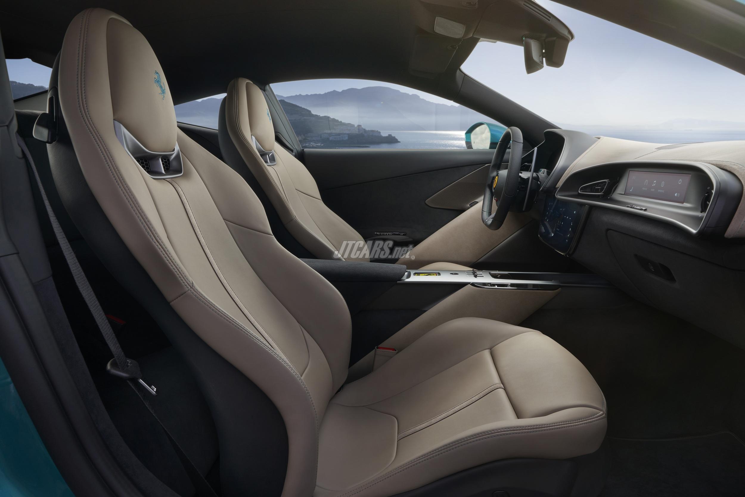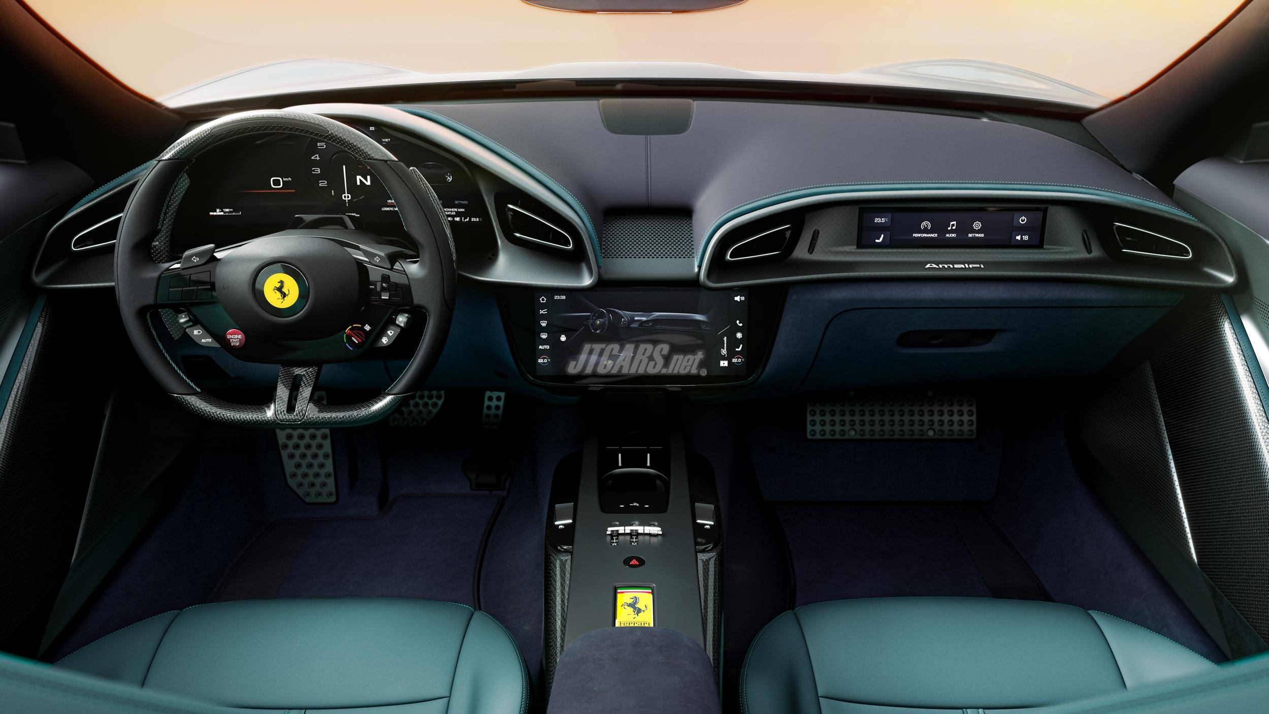 The Ferrari Amalfi’s interior features a dual-cockpit layout that wraps driver and passenger in connected, sculpted cells. A central touchscreen and faceted surfaces enhance the cocoon effect, while the clean design blends premium materials with advanced tech.