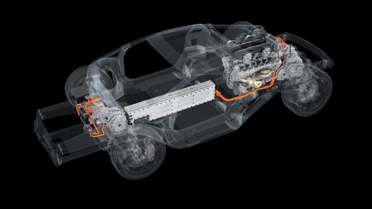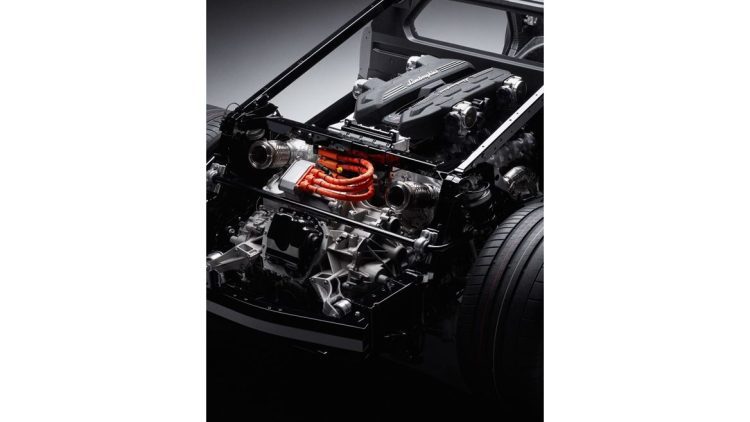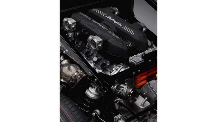 The car showcases an unprecedented layout: the naturally-aspirated 6.5-liter V12 mid-mounted engine is complemented by three electric motors, one of which is integrated into the new double-clutch eight-speed gearbox. This is mounted transversely and placed for the first time behind the combustion engine. In what has been the transmission tunnel since the days of the Countach, there is a lithium-ion battery instead, which powers the electric motors.