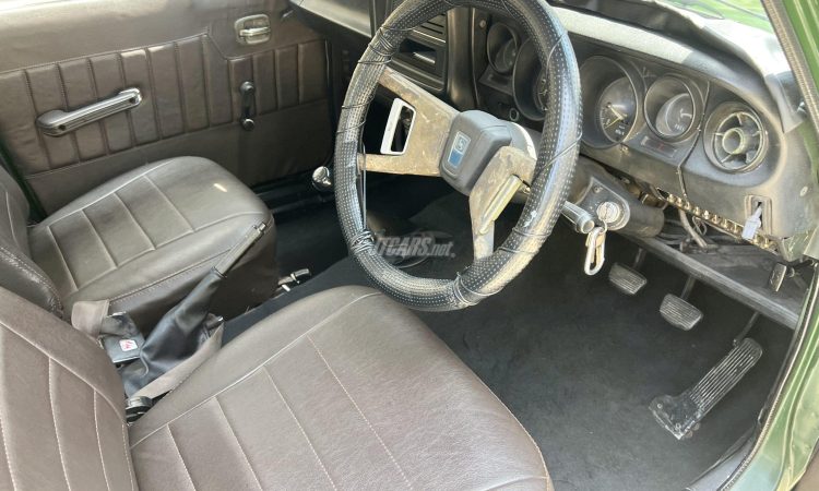 The DX trim level came equipped with enhanced chrome exterior detailing, full instrumentation, and upgraded interior upholstery. The original brown leather interior remains intact, preserving its authentic 1970s atmosphere.