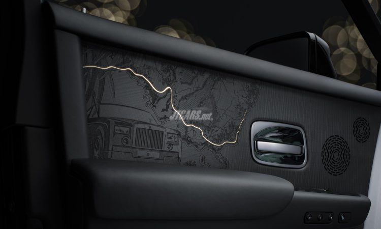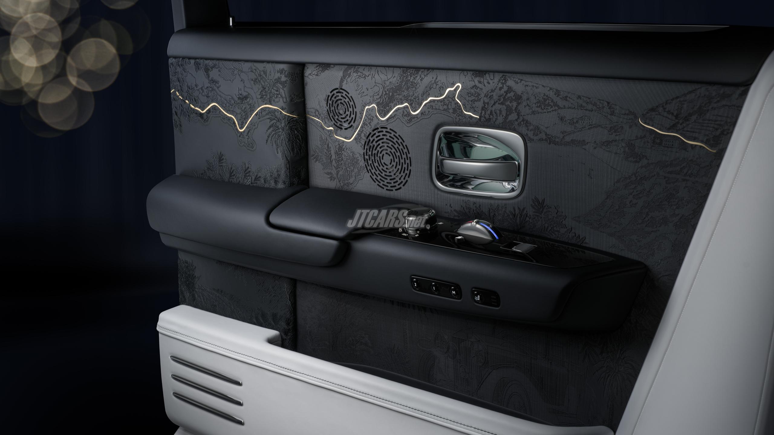 The Phantom Centenary Private Collection features the most intricate woodwork ever crafted for a Rolls-Royce. Made from stained Blackwood, each door panel illustrates Phantom’s historic journeys through maps, landscapes, and floral motifs. The rear doors depict Le Rayol-Canadel-sur-Mer, the front doors show West Wittering and the Australian crossing of the first Goodwood-era Phantom.