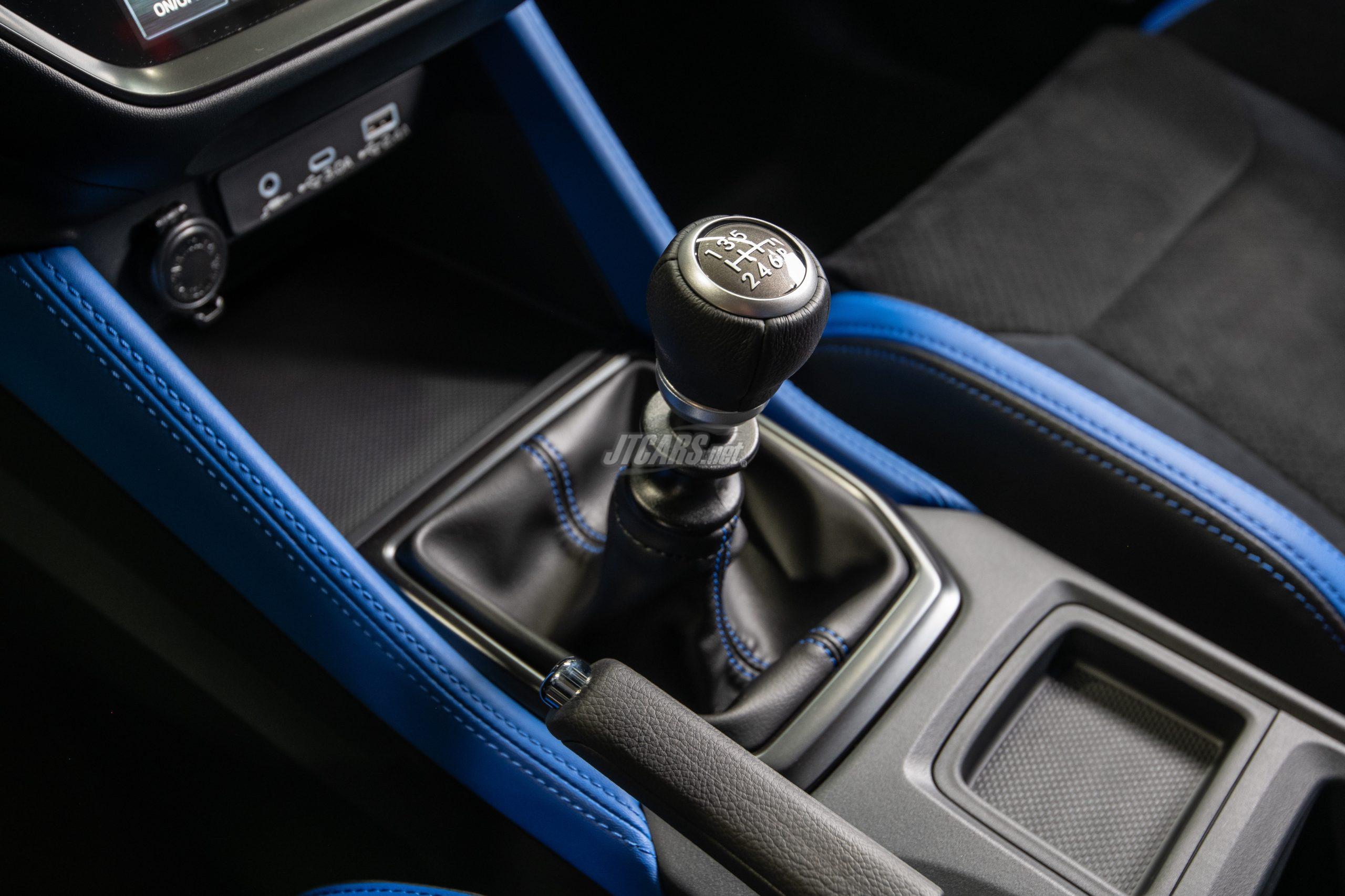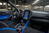 On the inside, the WRX tS features an all-new 12.3-inch digital gauge cluster, which offers improved legibility and the capability to prominently show additional information to the driver, including map display and route guidance information. The seat bolsters, steering wheel, door panels, and shifter trim are complemented by blue accents. The iconic STI logo is featured on the ignition start button. For weight savings, lower center of gravity, and additional headroom for helmeted drivers, the power moonroof has been deleted.