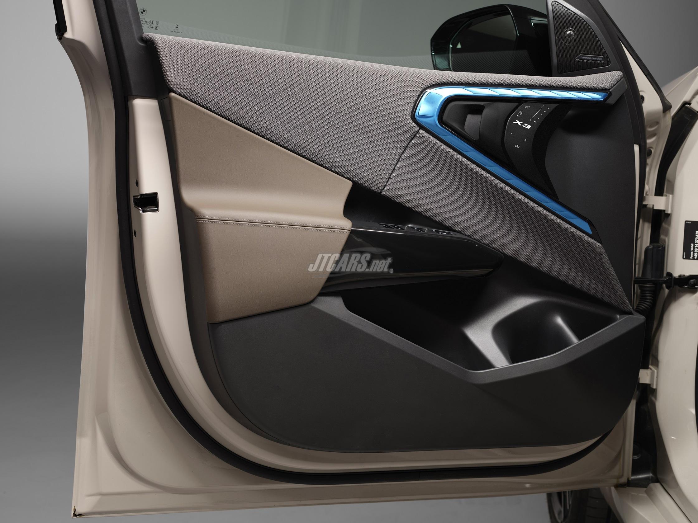 The cabin of the new BMW X3 blends robust SAV functionality with ample spaciousness and a premium ambience full of individual style. The BMW Curved Display, BMW Interaction Bar, steering wheels with a flat-bottomed rim, and the new gear selector toggle are the defining elements of the cockpit’s modern take on hallmark BMW driver-focused design. Other model-specific highlights include light elements in a contrasting color in the center console and door trims. This new design feature is located towards the front of the driver’s and front passenger doors, where it forms a border around function buttons, ventilation controllers, air vents and the robust door handles typically found on BMW X models.