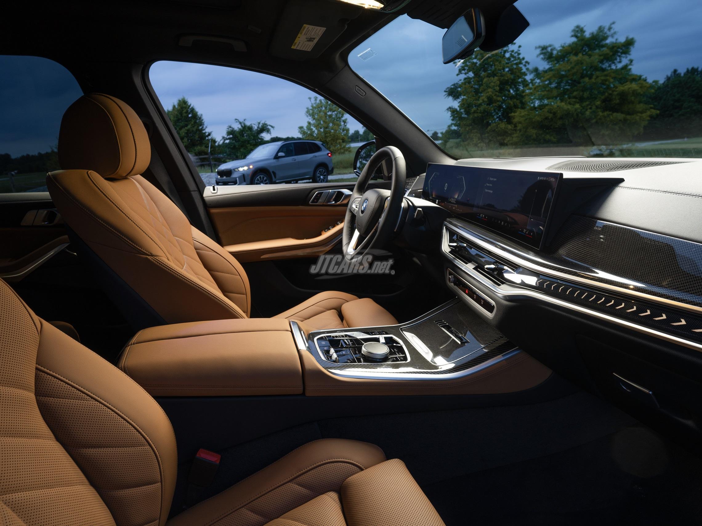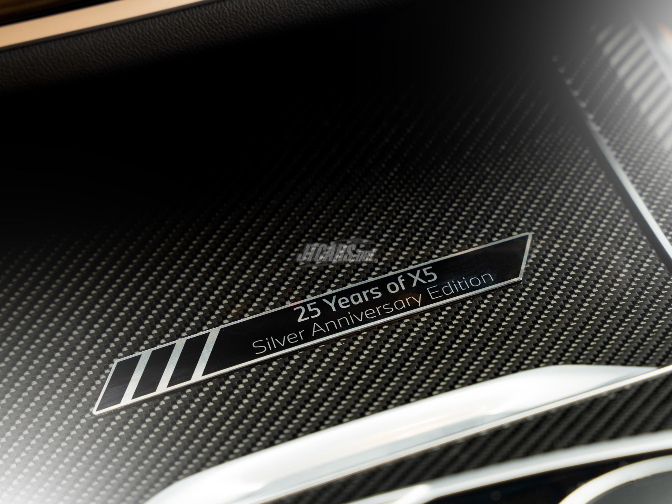 Inside, the sport seats are upholstered in the customer’s choice of Black, Cognac, Coffee, or Silverstone Sensafin. Carbon Fiber trim, ordinarily available only on the X5 M60i and X5 M Competition, embellishes the center console and dashboard. The BMW Curved Display is powered by BMW Operating System 8.5, and is enhanced by Live Cockpit Professional, which adds the full-color BMW Head-Up Display and BMW Maps navigation with Augmented Reality display. A Silver Anniversary Edition plaque adorns the compartment door ahead of the gear selector.