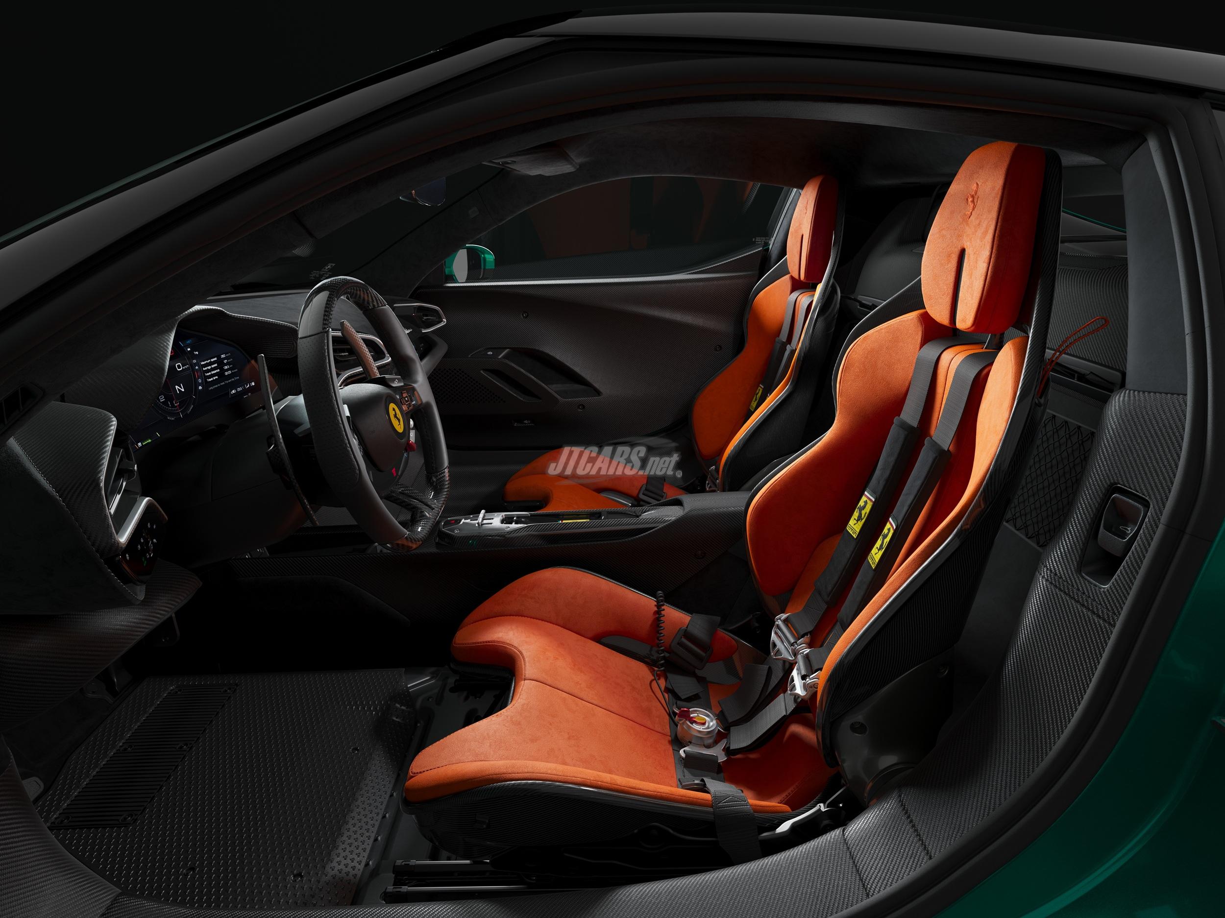 The interior of the 296 Speciale emphasizes a race-inspired, minimalist design, with a focus on weight reduction and function. Carbon fibre and Alcantara© are used extensively, creating a streamlined, performance-oriented cabin. The door panel is crafted from a single block of carbon fibre, with the grab handle integrated seamlessly, and the speakers incorporated directly into the panel.