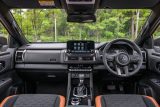 With the highest trim level, the front grille is the same color as the body, while the door mirrors, Dynamic Shield garnish, plated components including the door handles, bumper, and other parts are black, and the underside of the front, sides, and rear is dark titanium. A styling bar on the black roof rails, over fenders, and cargo bed brings a sharper look. The use of black as the base color for the metallic embellishments in the interior brings sleekness, while orange accents bring a sense of class and sharpness.