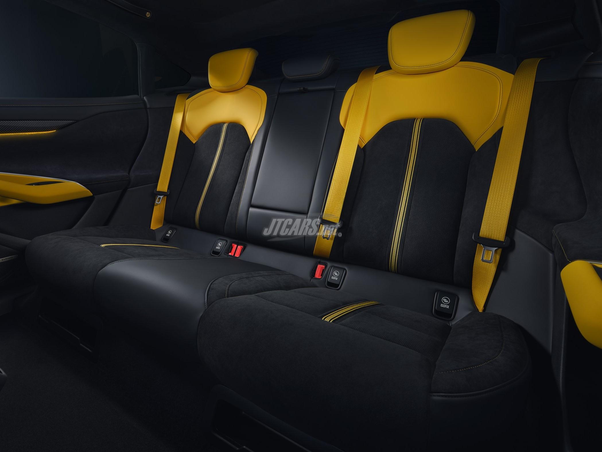 Inside, the SU7 Ultra sports enhanced seats with active side support and track-style embroidery, a carbon fiber steering wheel with Alcantara®️ grip, and a yellow centering marker for high-speed control. The cabin uses over 5m² of Italian Alcantara®️ fabric, covering seats, door panels, and dashboard stitching for a premium feel. Carbon fiber is also used extensively, with a 1.7m² roof and 17 components across the interior and exterior, reducing weight and reinforcing its sporty aesthetic.
